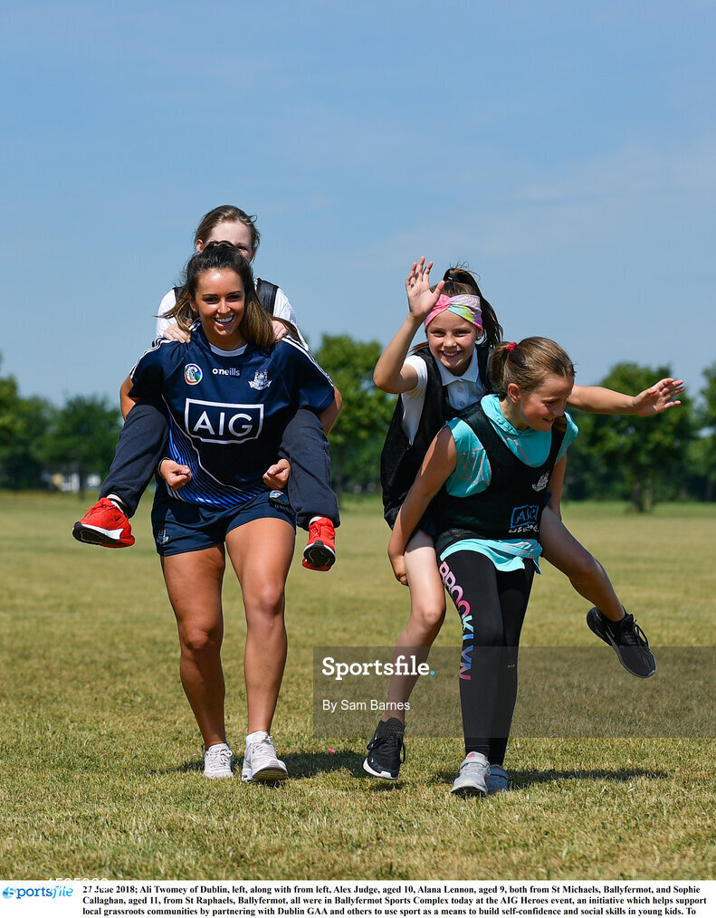 27 June 2018; Ali Twomey of Dublin, left, along with from left, Alex Judge, aged 10, Alana Lennon, aged 9, both from St Michaels, Ballyfermot, and Sophie Callaghan, aged 11, from St Raphaels, Ballyfermot, all were in Ballyfermot Sports Complex today at the AIG Heroes event, an initiative which helps support local grassroots communities by partnering with Dublin GAA and others to use sport as a means to build self-confidence and social skills in young kids. To further promote these efforts AIG Insurance gifted GAA equipment to primary schools in the area. Photo by Sam Barnes/Sportsfile