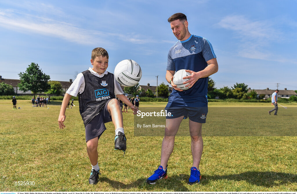 27 June 2018; Philip McMahon of Dublin and Bobby Doyle, aged 11, from De La Salle NS, Ballyfermot, were in Ballyfermot Sports Complex today at the AIG Heroes event, an initiative which helps support local grassroots communities by partnering with Dublin GAA and others to use sport as a means to build self-confidence and social skills in young kids. To further promote these efforts AIG Insurance gifted GAA equipment to primary schools in the area. Photo by Sam Barnes/Sportsfile