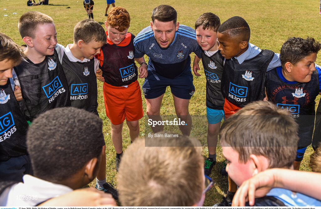 27 June 2018; Philip McMahon of Dublin, centre, was in Ballyfermot Sports Complex today at the AIG Heroes event, an initiative which helps support local grassroots communities by partnering with Dublin GAA and others to use sport as a means to build self-confidence and social skills in young kids. To further promote these efforts AIG Insurance gifted GAA equipment to primary schools in the area. Photo by Sam Barnes/Sportsfile