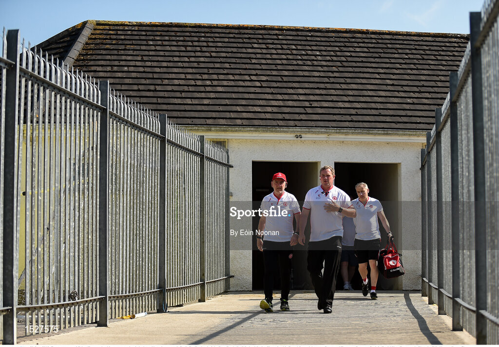 30 June 2018; Tyrone manager Mickey Harte makes his way out to the pitch along side assistant coach Gavin Devlin ahead of the GAA Football All-Ireland Senior Championship Round 3 match between Cavan and Tyrone at Brewster Park in Enniskillen, Fermanagh. Photo by Eóin Noonan/Sportsfile