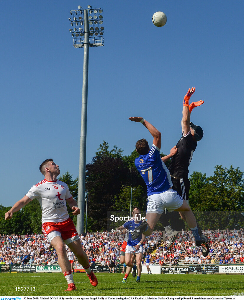 30 June 2018; Michael O’Neill of Tyrone in action against Fergal Reilly of Cavan during the GAA Football All-Ireland Senior Championship Round 3 match between Cavan and Tyrone at Brewster Park in Enniskillen, Fermanagh. Photo by Eóin Noonan/Sportsfile