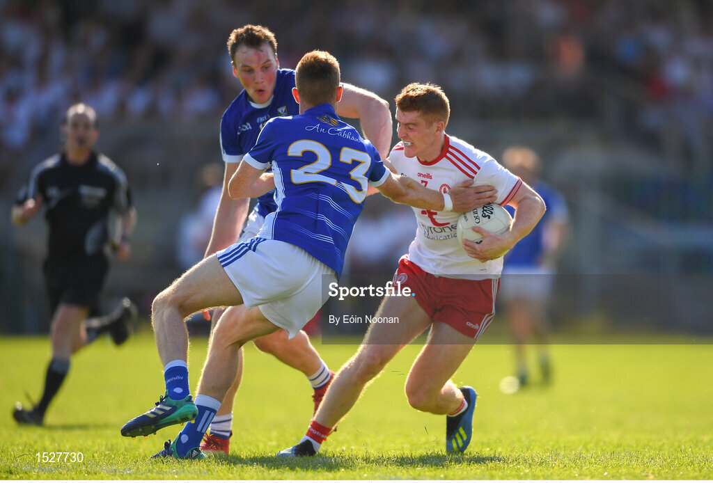 30 June 2018; Peter Harte of Tyrone is tackled by Jason McLoughlin of Cavan during the GAA Football All-Ireland Senior Championship Round 3 match between Cavan and Tyrone at Brewster Park in Enniskillen, Fermanagh. Photo by Eóin Noonan/Sportsfile