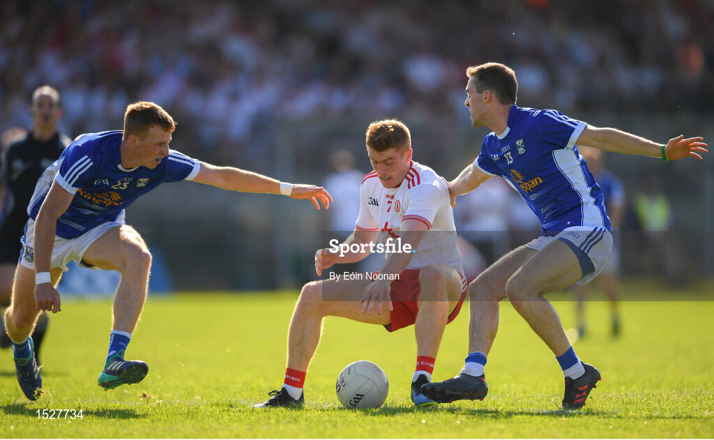 30 June 2018; Peter Harte of Tyrone in action against Jason McLoughlin, left, and Conor Bradley of Cavan during the GAA Football All-Ireland Senior Championship Round 3 match between Cavan and Tyrone at Brewster Park in Enniskillen, Fermanagh. Photo by Eóin Noonan/Sportsfile