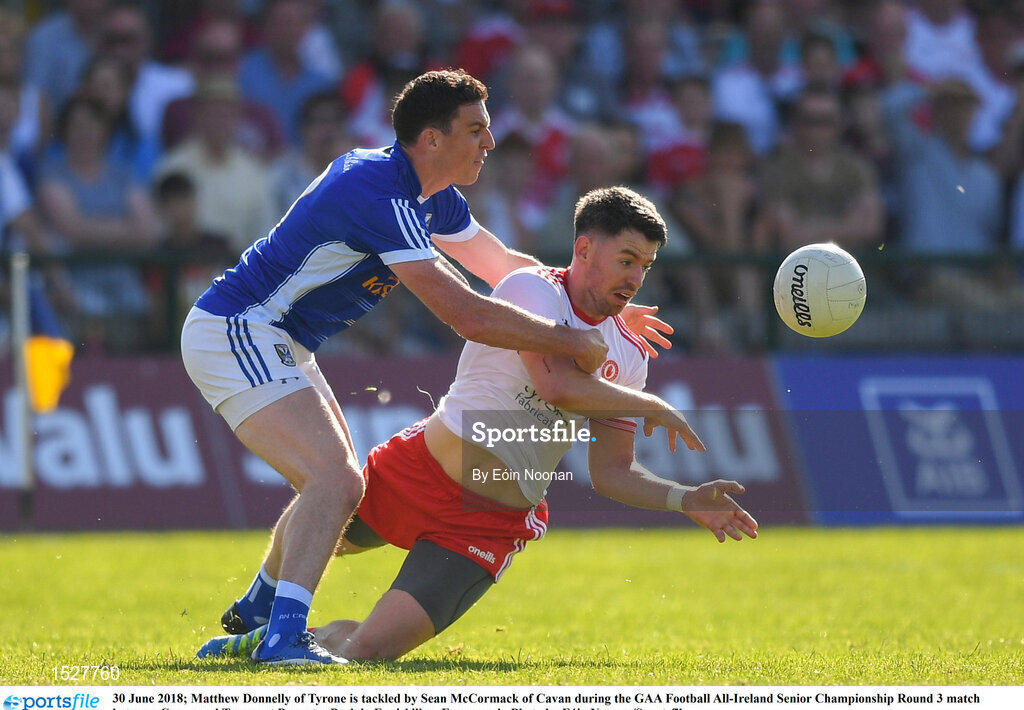 30 June 2018; Matthew Donnelly of Tyrone is tackled by Sean McCormack of Cavan during the GAA Football All-Ireland Senior Championship Round 3 match between Cavan and Tyrone at Brewster Park in Enniskillen, Fermanagh. Photo by Eóin Noonan/Sportsfile