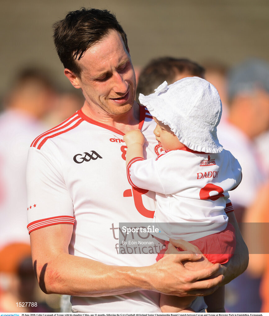 30 June 2018; Colm Cavanagh of Tyrone with his daughter Chloe, age 11 months, following the GAA Football All-Ireland Senior Championship Round 3 match between Cavan and Tyrone at Brewster Park in Enniskillen, Fermanagh. Photo by Eóin Noonan/Sportsfile