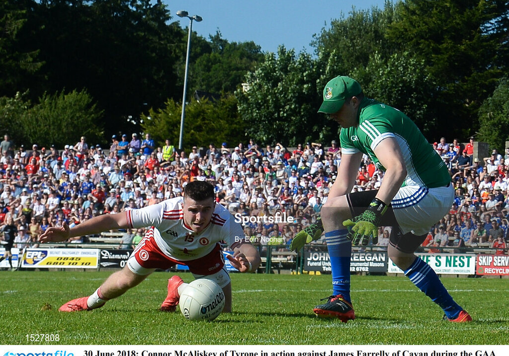 30 June 2018; Connor McAliskey of Tyrone in action against James Farrelly of Cavan during the GAA Football All-Ireland Senior Championship Round 3 match between Cavan and Tyrone at Brewster Park in Enniskillen, Fermanagh. Photo by Eóin Noonan/Sportsfile