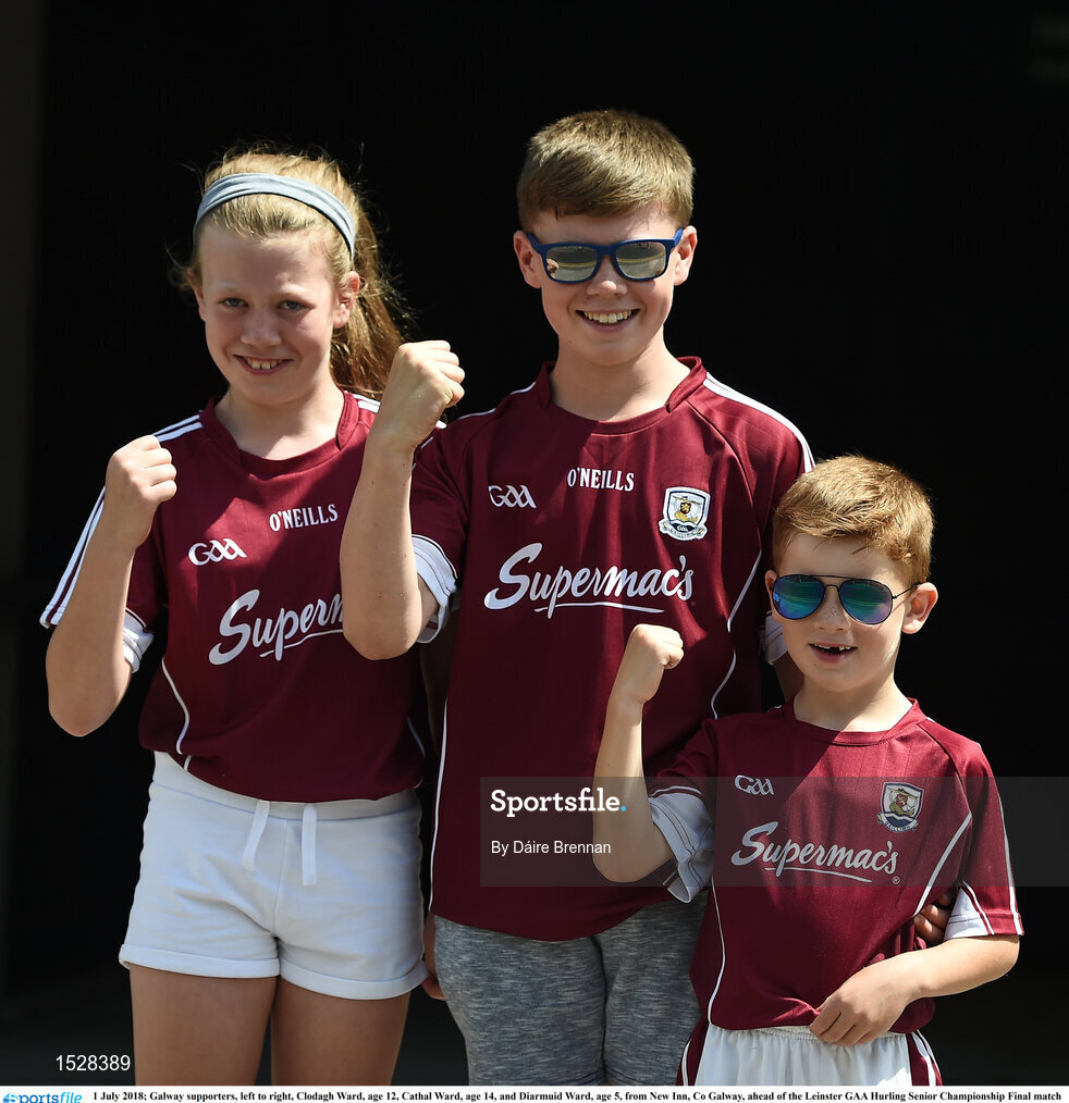 1 July 2018; Galway supporters, left to right, Clodagh Ward, age 12, Cathal Ward, age 14, and Diarmuid Ward, age 5, from New Inn, Co Galway, ahead of the Leinster GAA Hurling Senior Championship Final match between Kilkenny and Galway at Croke Park in Dublin. Photo by Daire Brennan/Sportsfile