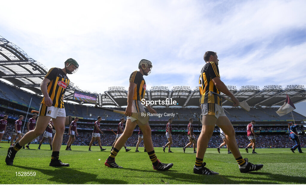 1 July 2018; Kilkenny players, from left, Joey Holden, Paddy Deegan and Padraig Walsh during the pre-match parade ahead of the Leinster GAA Hurling Senior Championship Final match between Kilkenny and Galway at Croke Park in Dublin. Photo by Ramsey Cardy/Sportsfile