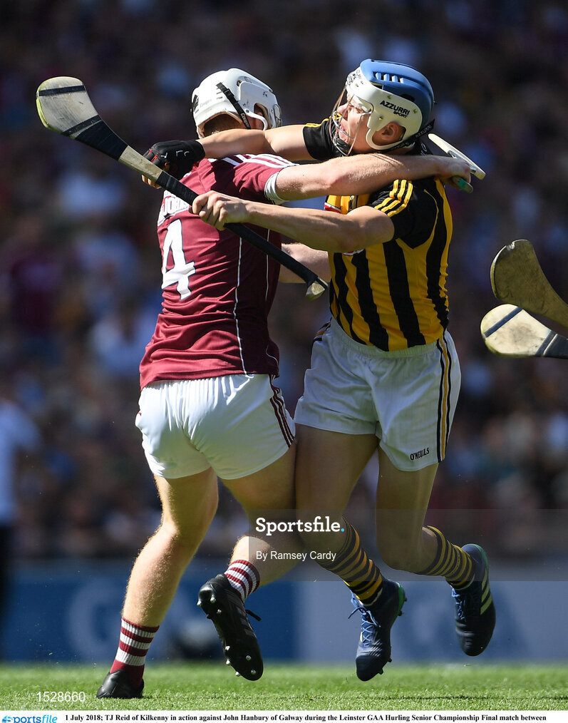 1 July 2018; TJ Reid of Kilkenny in action against John Hanbury of Galway during the Leinster GAA Hurling Senior Championship Final match between Kilkenny and Galway at Croke Park in Dublin. Photo by Ramsey Cardy/Sportsfile