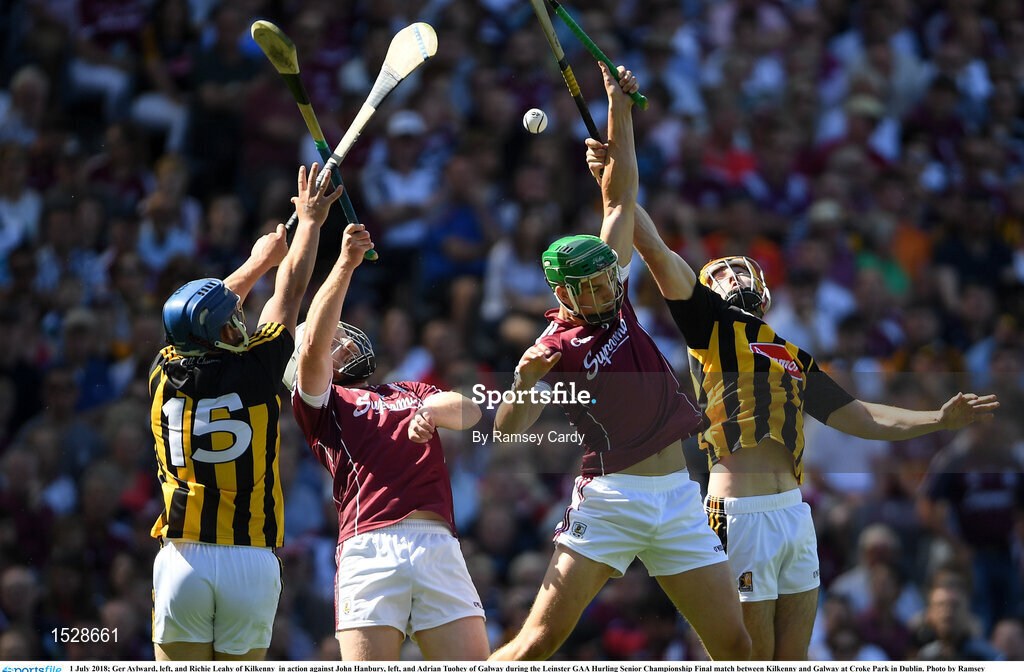 1 July 2018; Ger Aylward, left, and Richie Leahy of Kilkenny in action against John Hanbury, left, and Adrian Tuohey of Galway during the Leinster GAA Hurling Senior Championship Final match between Kilkenny and Galway at Croke Park in Dublin. Photo by Ramsey Cardy/Sportsfile