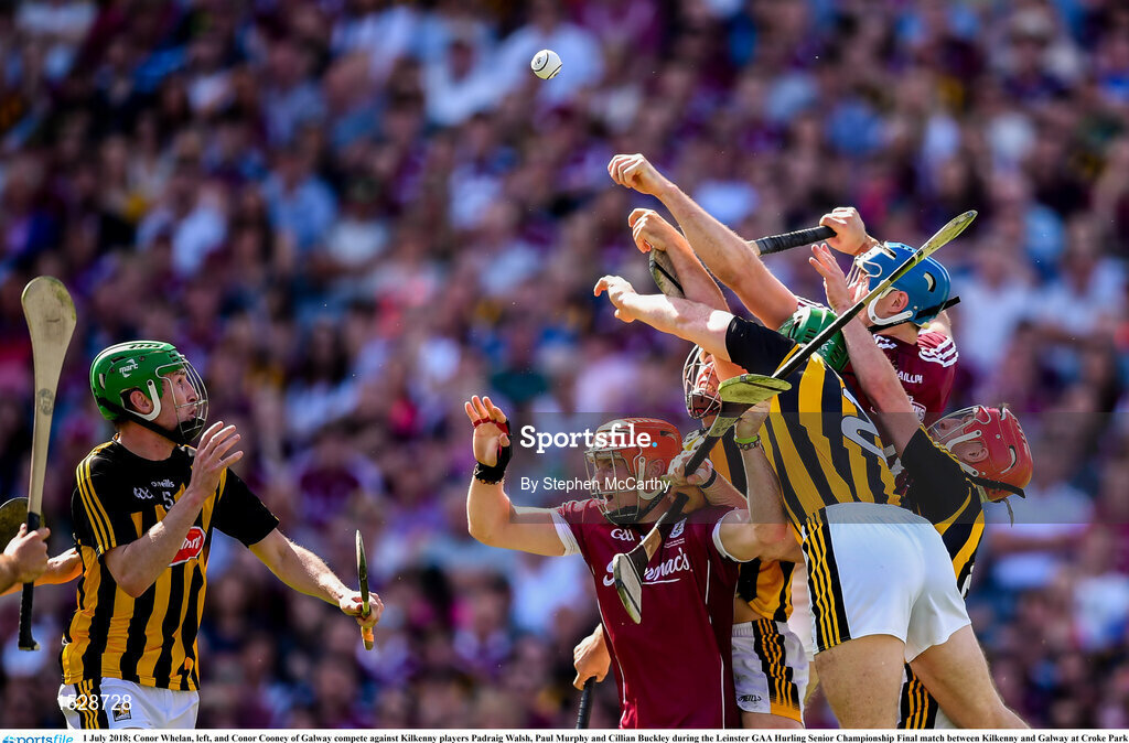 1 July 2018; Conor Whelan, left, and Conor Cooney of Galway compete against Kilkenny players Padraig Walsh, Paul Murphy and Cillian Buckley during the Leinster GAA Hurling Senior Championship Final match between Kilkenny and Galway at Croke Park in Dublin. Photo by Stephen McCarthy/Sportsfile