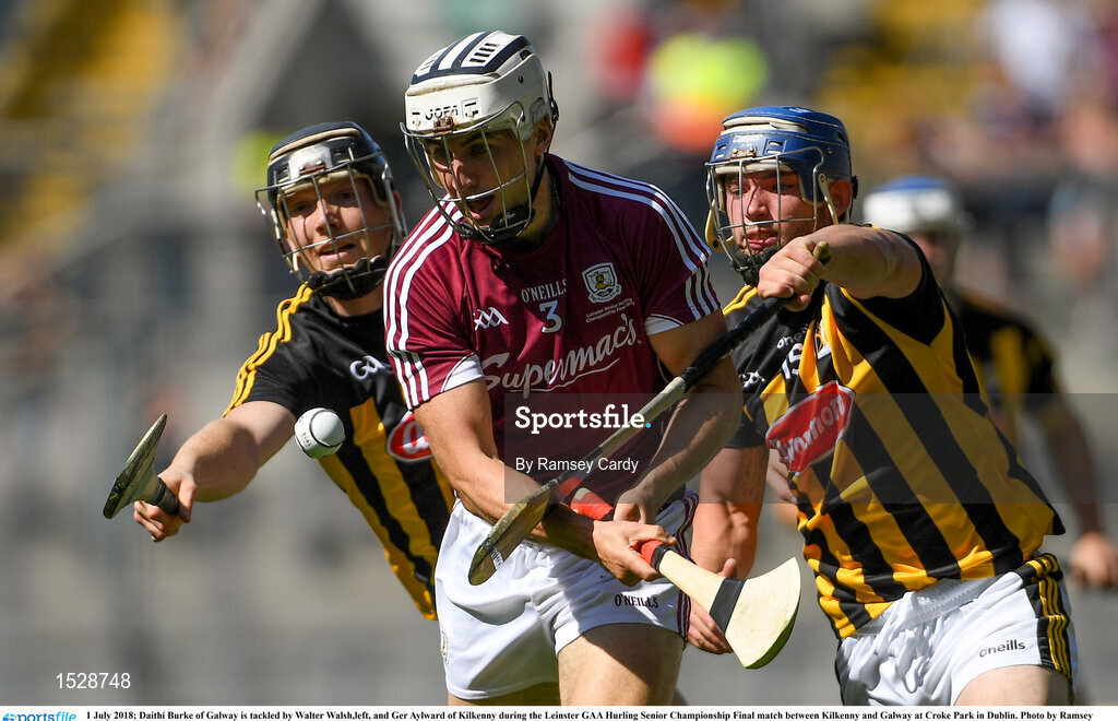 1 July 2018; Daithí Burke of Galway is tackled by Walter Walsh,left, and Ger Aylward of Kilkenny during the Leinster GAA Hurling Senior Championship Final match between Kilkenny and Galway at Croke Park in Dublin. Photo by Ramsey Cardy/Sportsfile