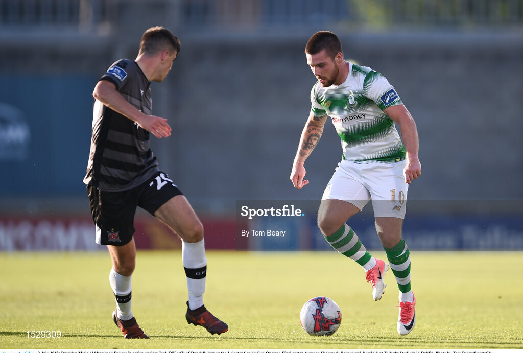 2 July 2018; Brandon Miele of Shamrock Rovers in action against Jack O'Keeffe of Dundalk during the Leinster Senior Cup Quarter-Final match between Shamrock Rovers and Dundalk at Tallaght Stadium in Dublin. Photo by Tom Beary/Sportsfile