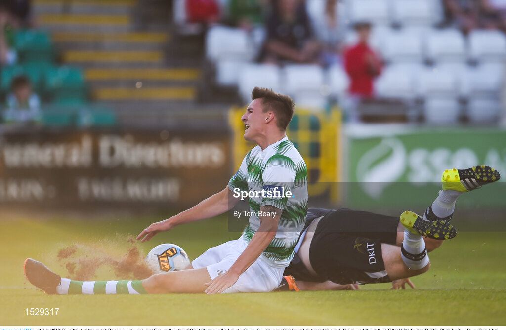 2 July 2018; Sean Boyd of Shamrock Rovers in action against George Poynton of Dundalk during the Leinster Senior Cup Quarter-Final match between Shamrock Rovers and Dundalk at Tallaght Stadium in Dublin. Photo by Tom Beary/Sportsfile