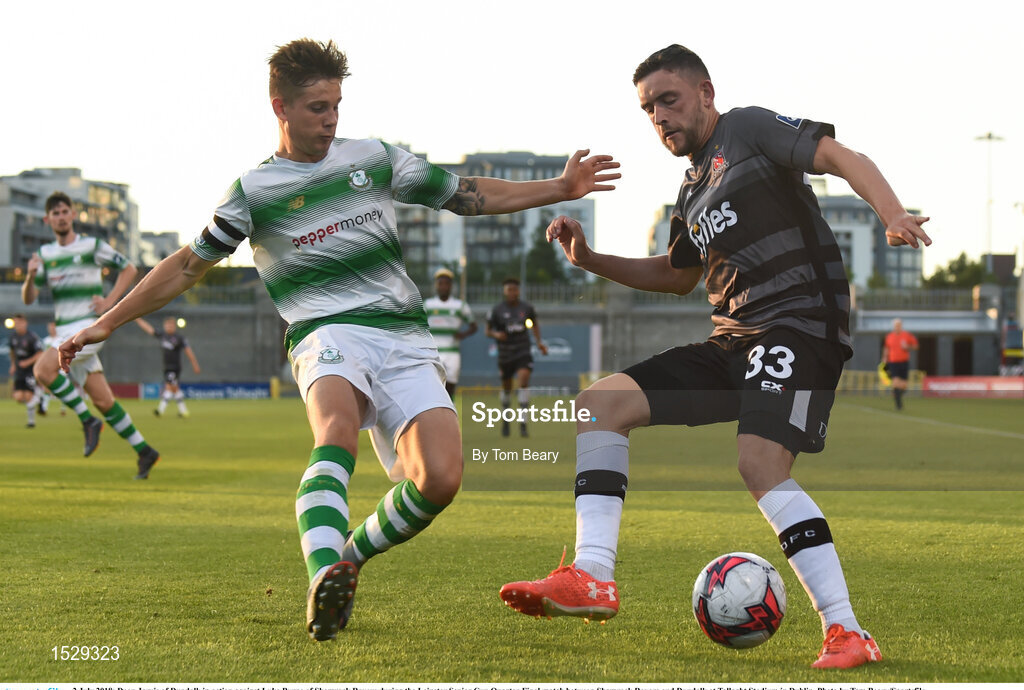 2 July 2018; Dean Jarvis of Dundalk in action against Luke Byrne of Shamrock Rovers during the Leinster Senior Cup Quarter-Final match between Shamrock Rovers and Dundalk at Tallaght Stadium in Dublin. Photo by Tom Beary/Sportsfile