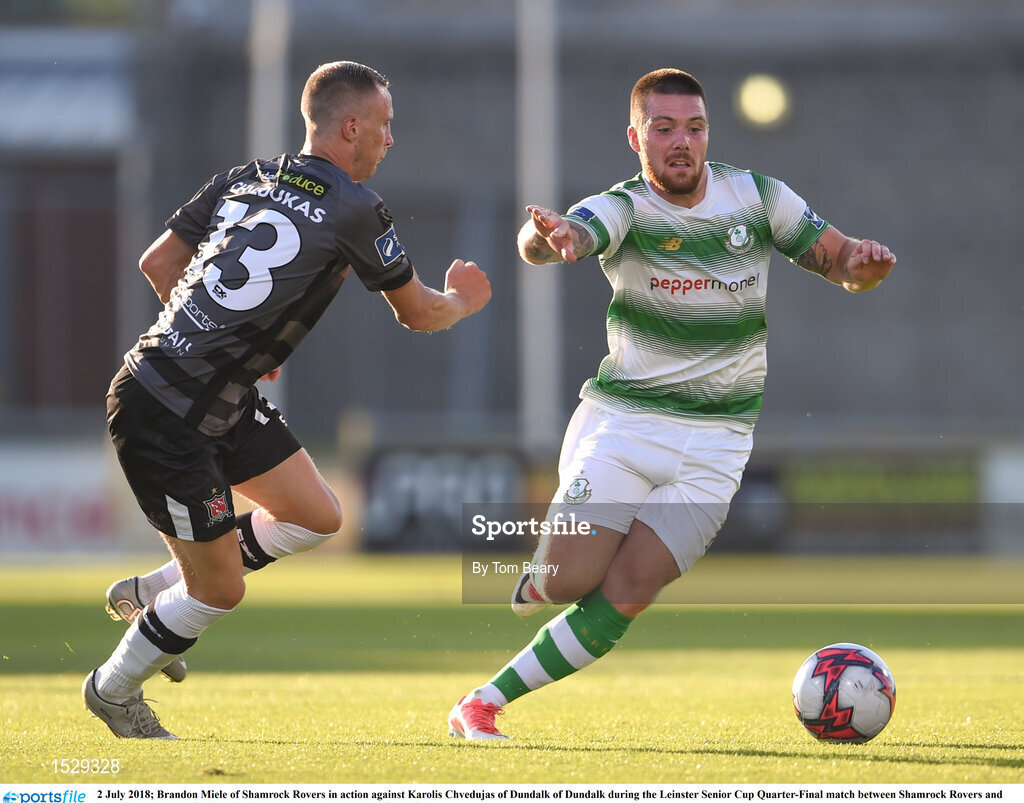 2 July 2018; Brandon Miele of Shamrock Rovers in action against Karolis Chvedukas of Dundalk of Dundalk during the Leinster Senior Cup Quarter-Final match between Shamrock Rovers and Dundalk at Tallaght Stadium in Dublin. Photo by Tom Beary/Sportsfile
