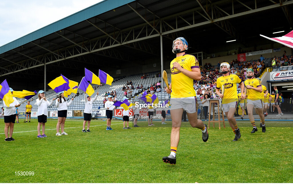 4 July 2018; Conor Firman of Wexford leads out the Wexford team prior to the Bord Gais Energy Leinster Under 21 Hurling Championship 2018 Final match between Wexford and Galway at O'Moore Park in Portlaoise, Co Laois. Photo by Sam Barnes/Sportsfile