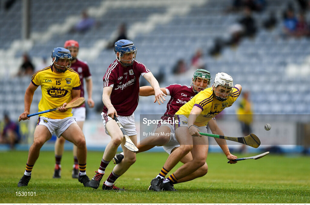 4 July 2018; Rory O'Connor of Wexford in action against Shane Bannon, left, and Fintan Burke of Galway during the Bord Gais Energy Leinster Under 21 Hurling Championship 2018 Final match between Wexford and Galway at O'Moore Park in Portlaoise, Co Laois. Photo by Harry Murphy/Sportsfile