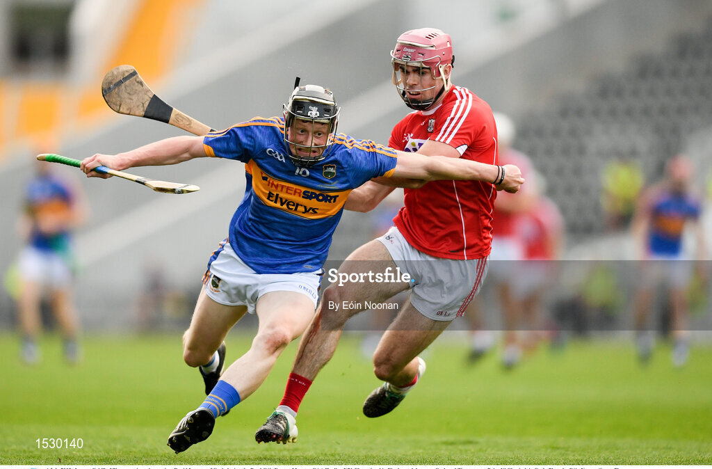 4 July 2018; Jerome Cahill of Tipperary in action against David Lowney of Cork during the Bord Gáis Energy Munster GAA Hurling U21 Championship Final match between Cork and Tipperary at Pairc Ui Chaoimh in Cork. Photo by Eóin Noonan/Sportsfile