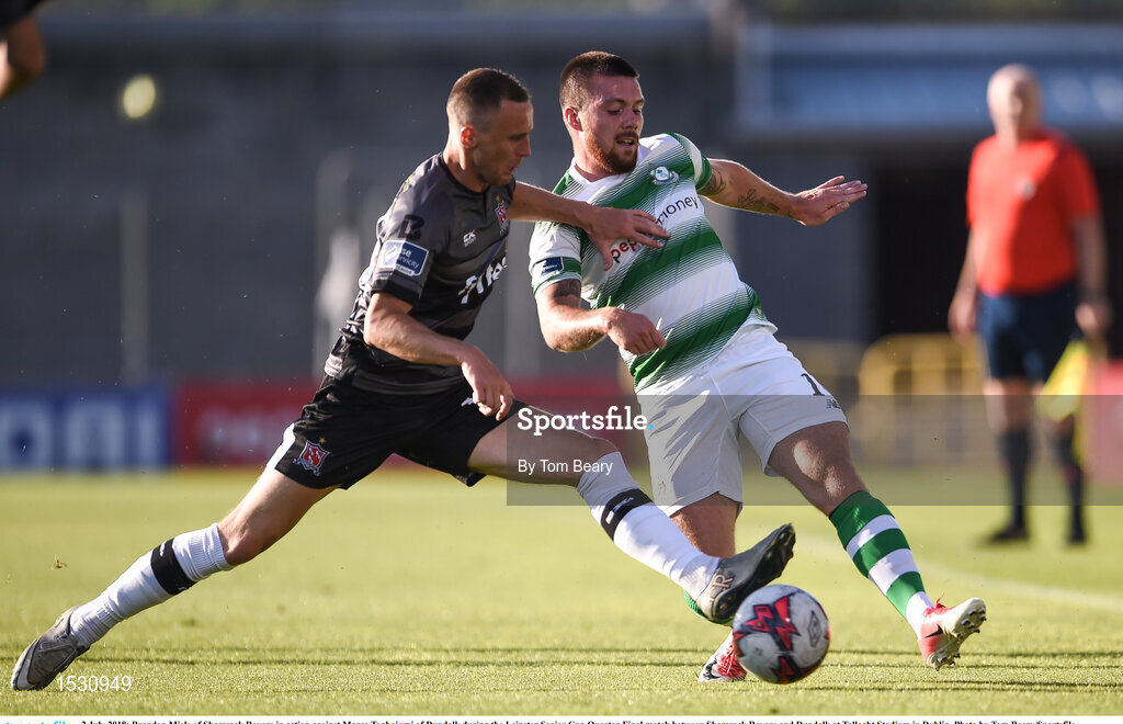 2 July 2018; Brandon Miele of Shamrock Rovers in action against Marco Tagbajumi of Dundalk during the Leinster Senior Cup Quarter-Final match between Shamrock Rovers and Dundalk at Tallaght Stadium in Dublin. Photo by Tom Beary/Sportsfile