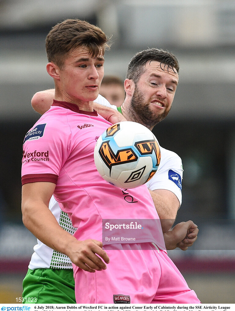 6 July 2018; Aaron Dobbs of Wexford FC in action against Conor Earley of Cabinteely during the SSE Airticity League First Division match between Cabinteely and Wexford FC at Stradbrook in Dublin. Photo by Matt Browne/Sportsfile