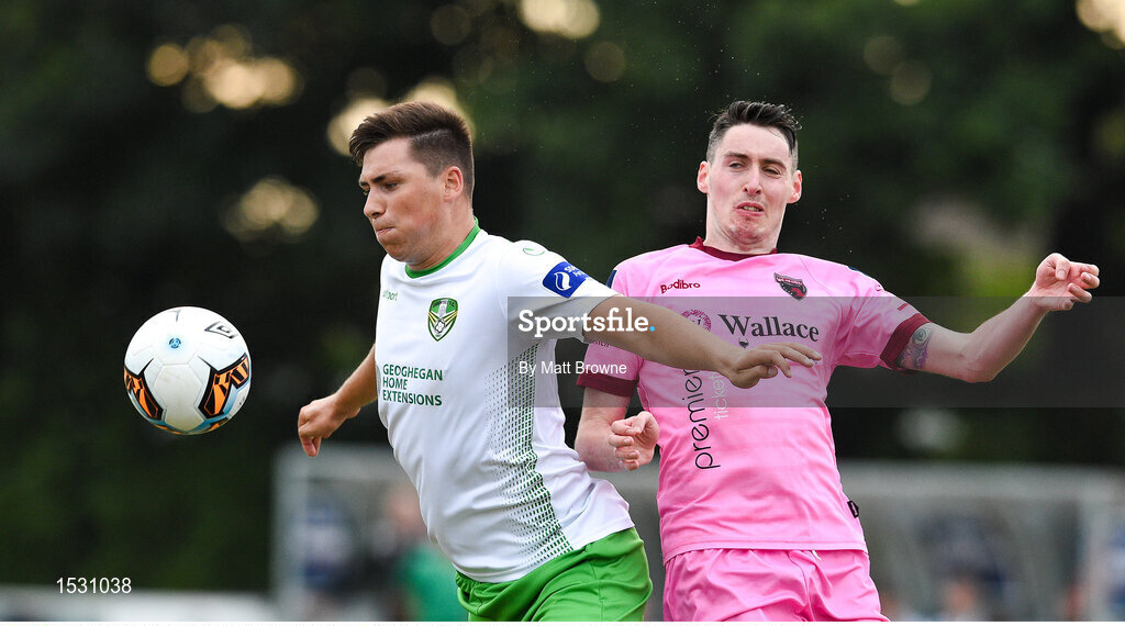 6 July 2018; Luke Clucas of Cabinteely in action against John Morgan of Wexford FC during the SSE Airticity League First Division match between Cabinteely and Wexford FC at Stradbrook in Dublin. Photo by Matt Browne/Sportsfile