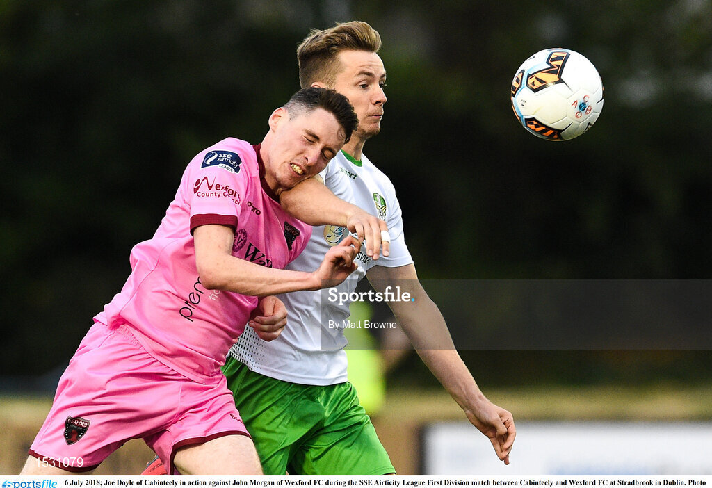 6 July 2018; Joe Doyle of Cabinteely in action against John Morgan of Wexford FC during the SSE Airticity League First Division match between Cabinteely and Wexford FC at Stradbrook in Dublin. Photo by Matt Browne/Sportsfile