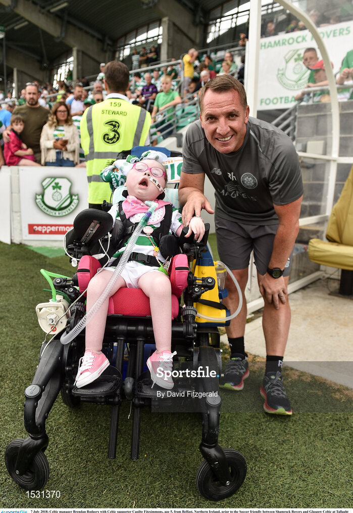 7 July 2018; Celtic manager Brendan Rodgers with Celtic supporter Caoilte Fitzsimmons, age 5, from Belfast, Northern Ireland, prior to the friendly match between Shamrock Rovers and Glasgow Celtic at Tallaght Stadium in Tallaght, Co. Dublin. Photo by David Fitzgerald/Sportsfile