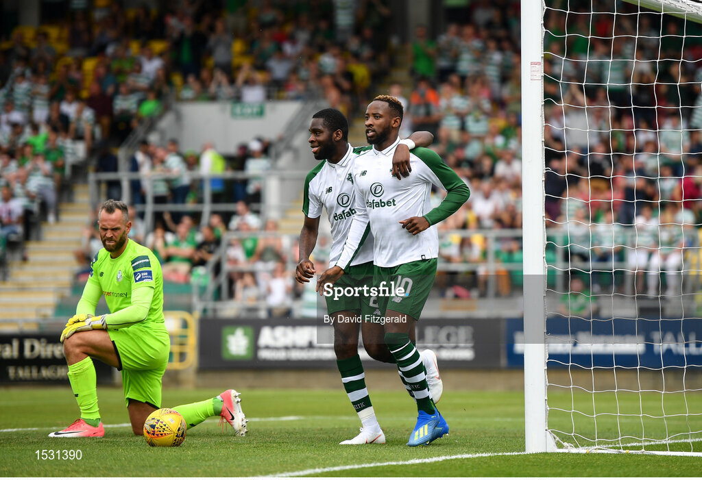 7 July 2018; Moussa Dembele of Glasgow Celtic celebrates after scoring his side's first goal with team mate Odsonne Edouard during the friendly match between Shamrock Rovers and Glasgow Celtic at Tallaght Stadium in Tallaght, Co. Dublin. Photo by David Fitzgerald/Sportsfile