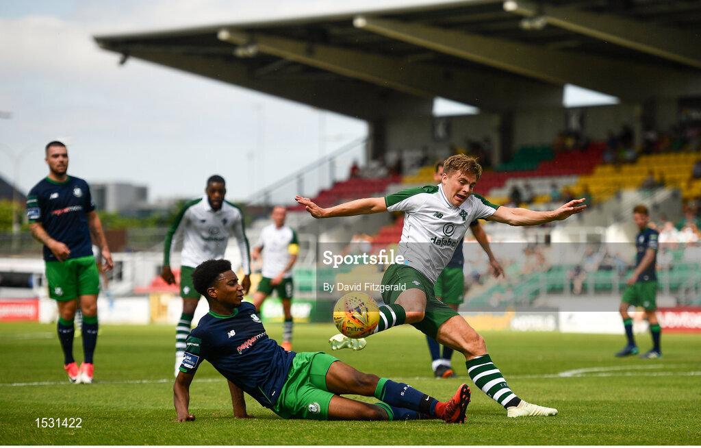 7 July 2018; James Forrest of Celtic in action against Eric Abulu of Shamrock Rovers during the friendly match between Shamrock Rovers and Glasgow Celtic at Tallaght Stadium in Tallaght, Co. Dublin. Photo by David Fitzgerald/Sportsfile