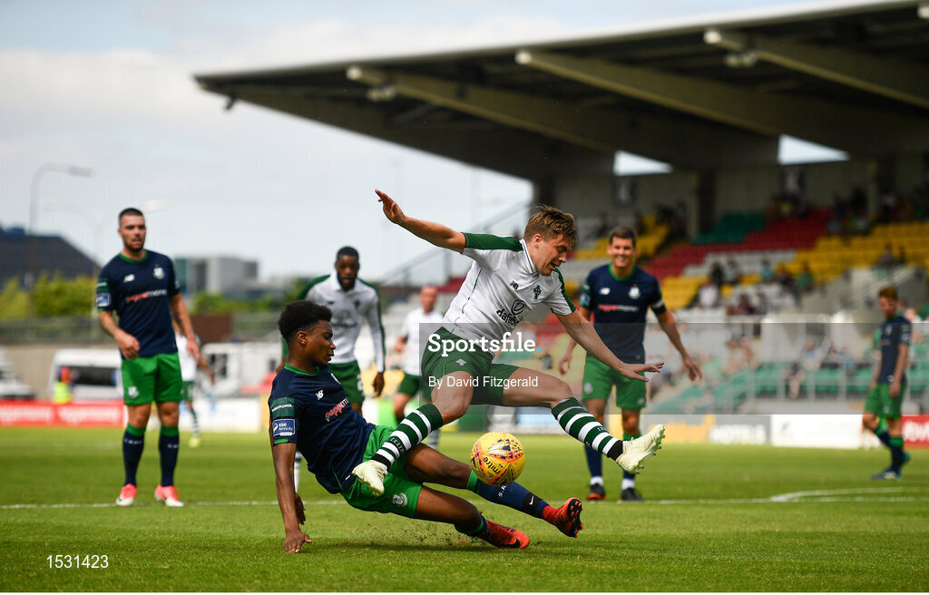 7 July 2018; James Forrest of Celtic in action against Eric Abulu of Shamrock Rovers during the friendly match between Shamrock Rovers and Glasgow Celtic at Tallaght Stadium in Tallaght, Co. Dublin. Photo by David Fitzgerald/Sportsfile