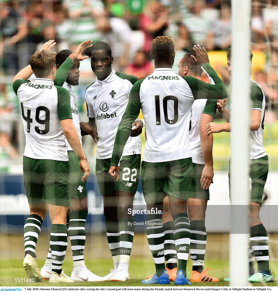 7 July 2018; Odsonne Edouard (22) celebrates after scoring his side's second goal with team mates during the friendly match between Shamrock Rovers and Glasgow Celtic at Tallaght Stadium in Tallaght, Co. Dublin. Photo by David Fitzgerald/Sportsfile