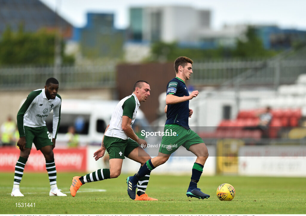 7 July 2018; Dylan Watts of Shamrock Rovers in action against Scott Brown of Celtic during the friendly match between Shamrock Rovers and Glasgow Celtic at Tallaght Stadium in Tallaght, Co. Dublin. Photo by David Fitzgerald/Sportsfile