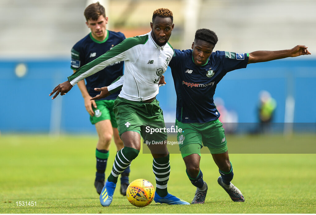 7 July 2018; Moussa Dembele of Celtic in action against Thomas Oluwya of Shamrock Rovers during the friendly match between Shamrock Rovers and Glasgow Celtic at Tallaght Stadium in Tallaght, Co. Dublin. Photo by David Fitzgerald/Sportsfile