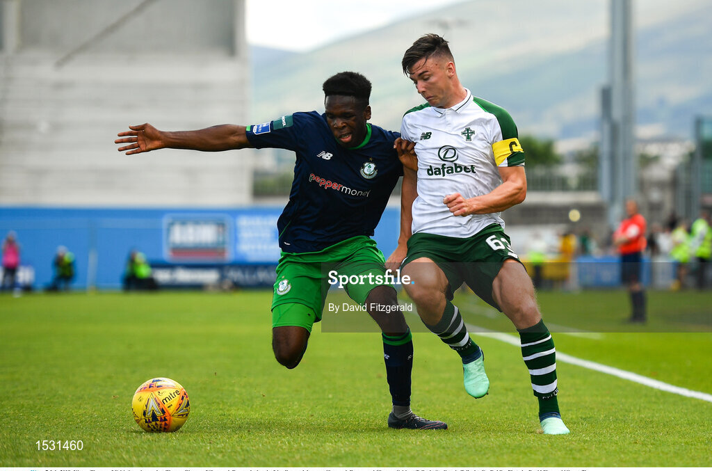 7 July 2018; Kieran Tierney of Celtic in action against Thomas Oluwya of Shamrock Rovers during the friendly match between Shamrock Rovers and Glasgow Celtic at Tallaght Stadium in Tallaght, Co. Dublin. Photo by David Fitzgerald/Sportsfile