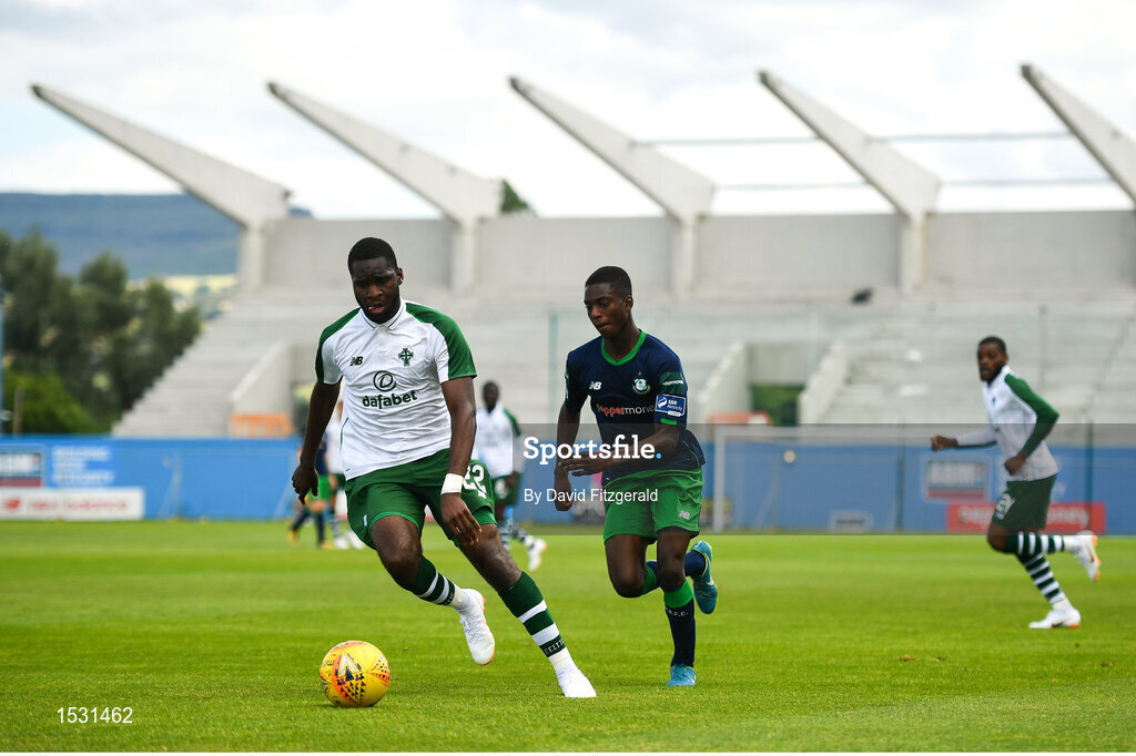 7 July 2018; Odsonne Edouard of Celtic in action against Martins Olakanye of Shamrock Rovers during the friendly match between Shamrock Rovers and Glasgow Celtic at Tallaght Stadium in Tallaght, Co. Dublin. Photo by David Fitzgerald/Sportsfile