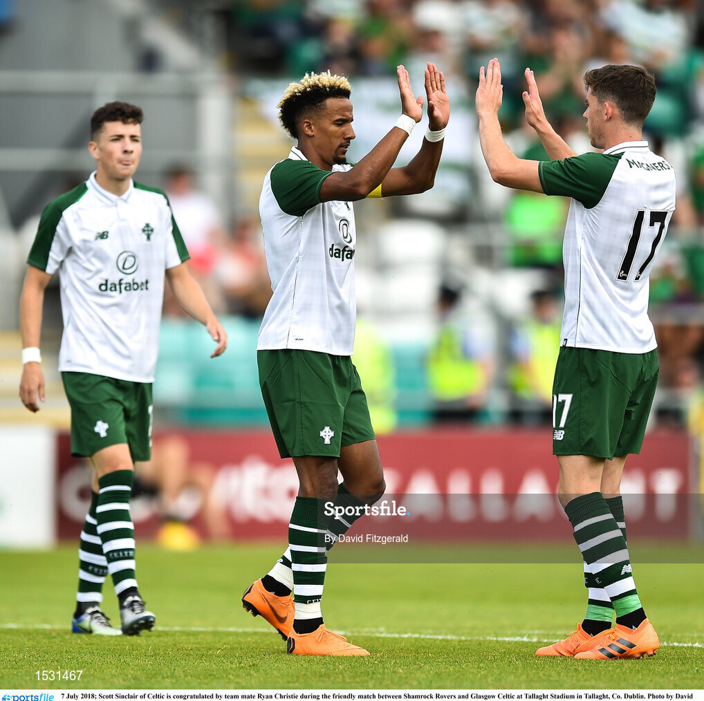 7 July 2018; Scott Sinclair of Celtic is congratulated by team mate Ryan Christie during the friendly match between Shamrock Rovers and Glasgow Celtic at Tallaght Stadium in Tallaght, Co. Dublin. Photo by David Fitzgerald/Sportsfile