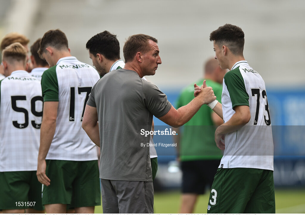 7 July 2018; Celtic manager Brendan Rodgers high fives Mikey Johnston before he comes on as a substitute during the friendly match between Shamrock Rovers and Glasgow Celtic at Tallaght Stadium in Tallaght, Co. Dublin. Photo by David Fitzgerald/Sportsfile