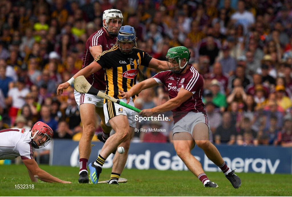 8 July 2018; Ger Aylward of Kilkenny kicks a goal, in the 34th minute, under pressure from Galway goalkeeper James Skehill, left, Adrian Tuohey, right, and Gearóid McInerney during the Leinster GAA Hurling Senior Championship Final Replay match between Kilkenny and Galway at Semple Stadium in Thurles, Co Tipperary. Photo by Ray McManus/Sportsfile