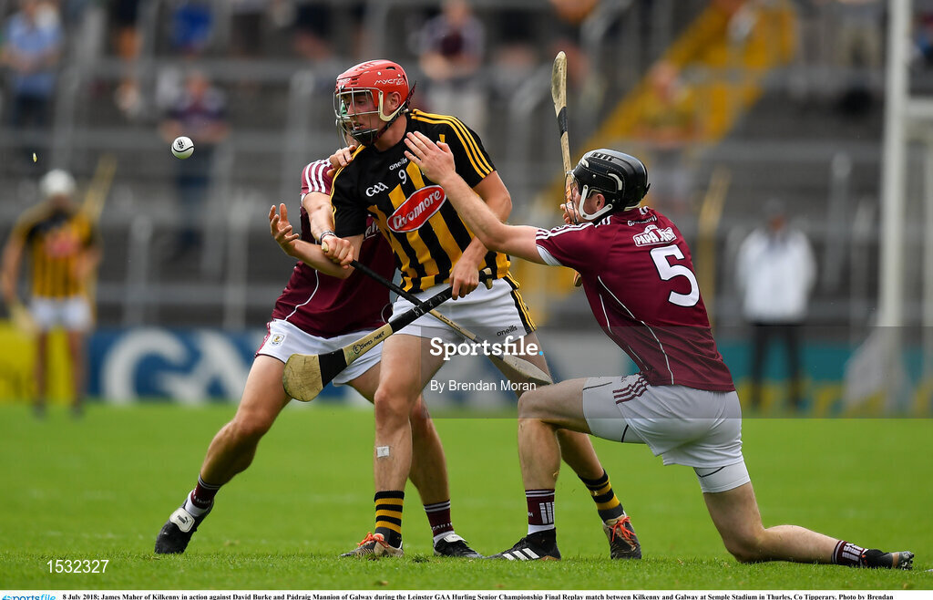 8 July 2018; James Maher of Kilkenny in action against David Burke and Pádraig Mannion of Galway during the Leinster GAA Hurling Senior Championship Final Replay match between Kilkenny and Galway at Semple Stadium in Thurles, Co Tipperary. Photo by Brendan Moran/Sportsfile