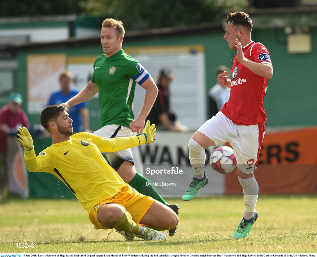 8 July 2018; Lewis Morrison of Sligo has his shot saved by goal keeper Evan Moran of Bray Wanderers during the SSE Airtricity League Premier Division match between Bray Wanderers and Sligo Rovers at the Carlisle Grounds in Bray, Co Wicklow. Photo by Matt Browne/Sportsfile