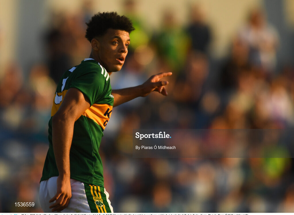 29 June 2018; Stefan Okunbor of Kerry during the EirGrid Munster GAA Football U20 Championship Final match between Kerry and Cork at Austin Stack Park in Tralee, Kerry. Photo by Piaras Ó Mídheach/Sportsfile