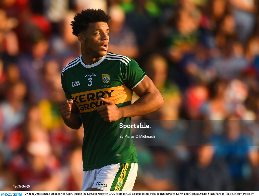 29 June 2018; Stefan Okunbor of Kerry during the EirGrid Munster GAA Football U20 Championship Final match between Kerry and Cork at Austin Stack Park in Tralee, Kerry. Photo by Piaras Ó Mídheach/Sportsfile