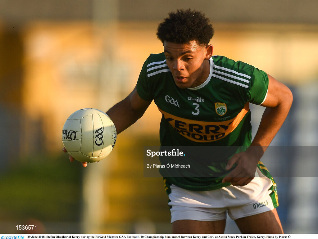 29 June 2018; Stefan Okunbor of Kerry during the EirGrid Munster GAA Football U20 Championship Final match between Kerry and Cork at Austin Stack Park in Tralee, Kerry. Photo by Piaras Ó Mídheach/Sportsfile