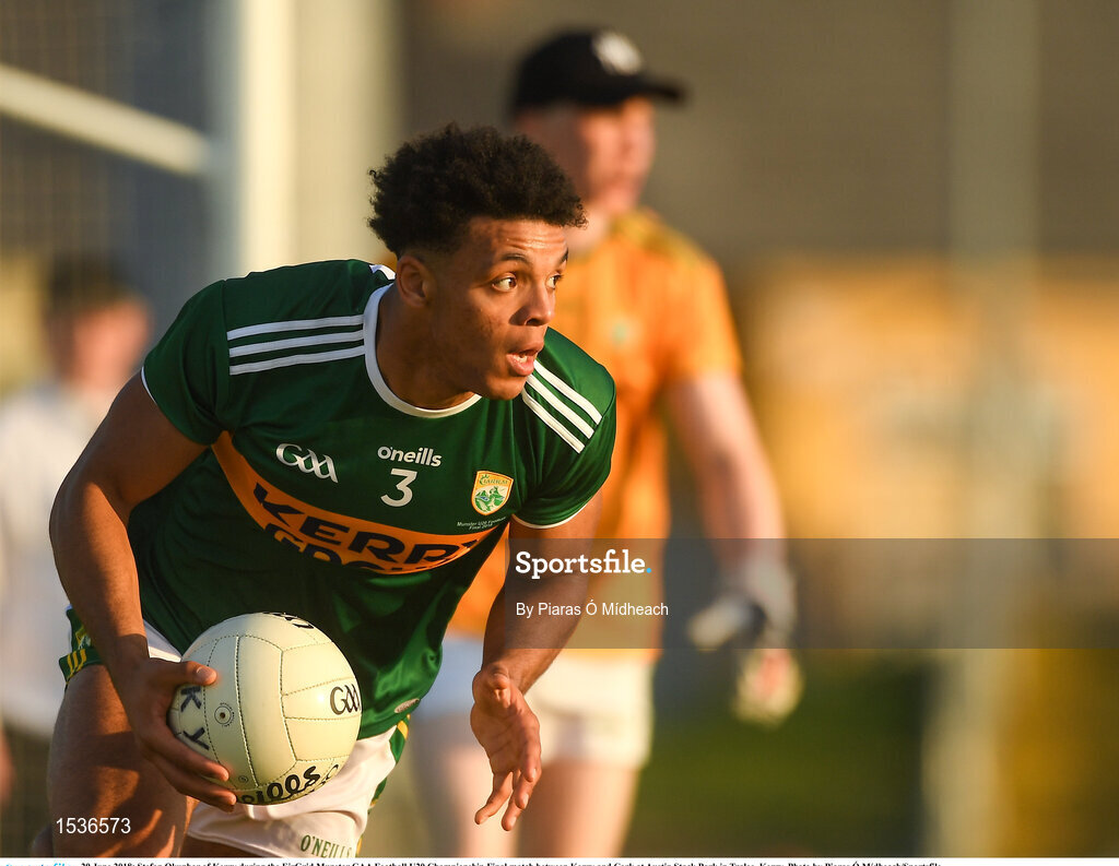 29 June 2018; Stefan Okunbor of Kerry during the EirGrid Munster GAA Football U20 Championship Final match between Kerry and Cork at Austin Stack Park in Tralee, Kerry. Photo by Piaras Ó Mídheach/Sportsfile