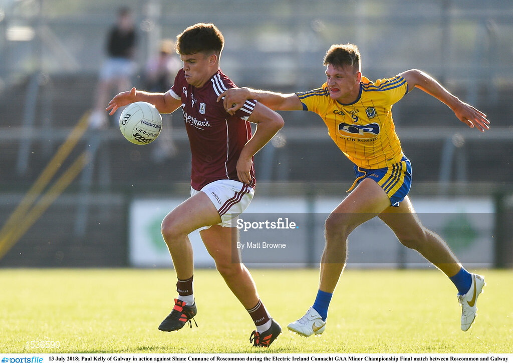 13 July 2018; Paul Kelly of Galway in action against Shane Cunnane of Roscommon during the Electric Ireland Connacht GAA Minor Championship Final match between Roscommon and Galway at Dr Hyde Park in Roscommon. Photo by Matt Browne/Sportsfile