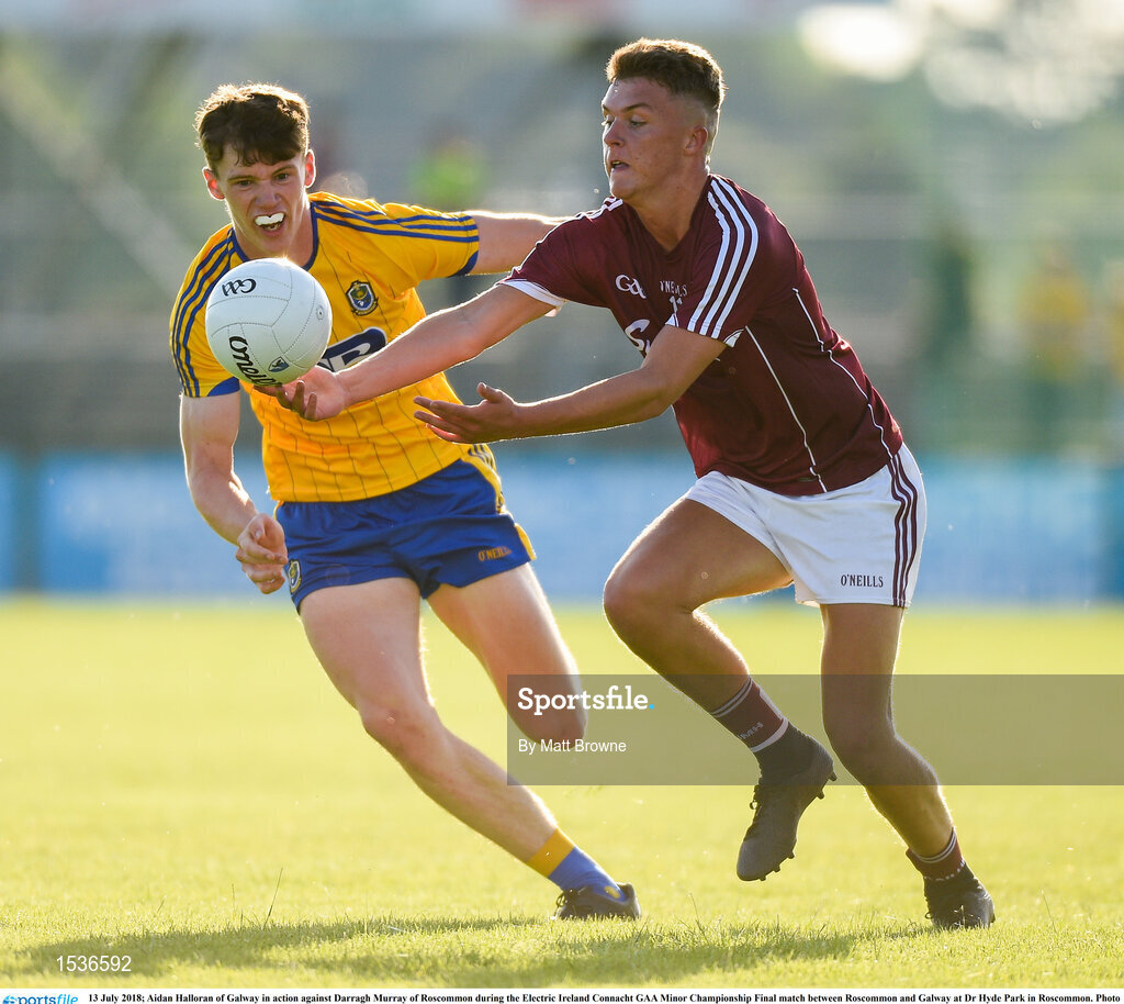 13 July 2018; Aidan Halloran of Galway in action against Darragh Murray of Roscommon during the Electric Ireland Connacht GAA Minor Championship Final match between Roscommon and Galway at Dr Hyde Park in Roscommon. Photo by Matt Browne/Sportsfile
