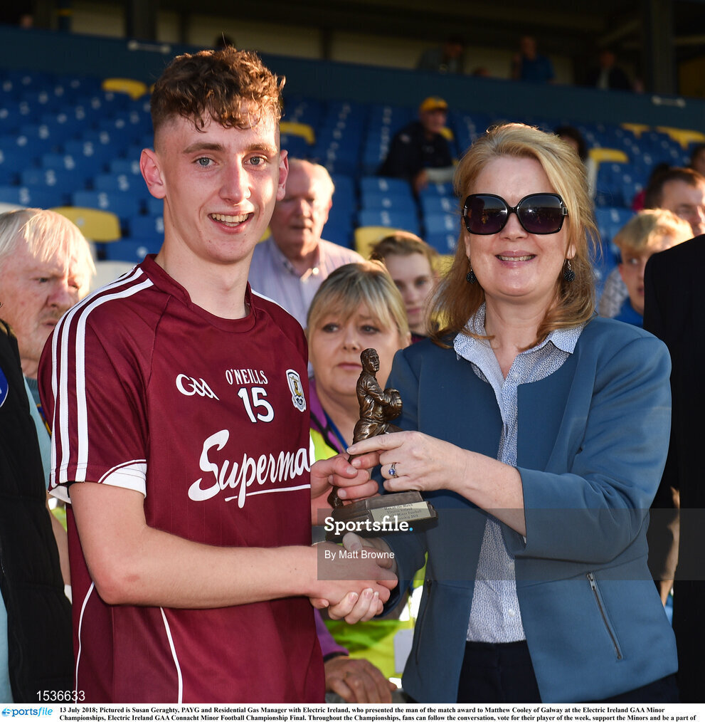 13 July 2018; Pictured is Susan Geraghty, PAYG and Residential Gas Manager with Electric Ireland, who presented the man of the match award to Matthew Cooley of Galway at the Electric Ireland GAA Minor Championships, Electric Ireland GAA Connacht Minor Football Championship Final. Throughout the Championships, fans can follow the conversation, vote for their player of the week, support the Minors and be a part of something major through the hashtag #GAAThisIsMajor. Photo by Matt Browne/Sportsfile