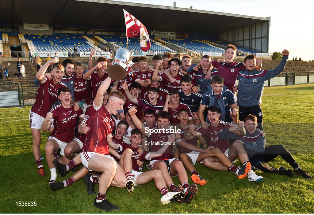 13 July 2018; Galway captain Conor Raftery lifts the cup as his team-mates celebrate following the Electric Ireland Connacht GAA Minor Championship Final match between Roscommon and Galway at Dr Hyde Park in Roscommon. Photo by Matt Browne/Sportsfile
