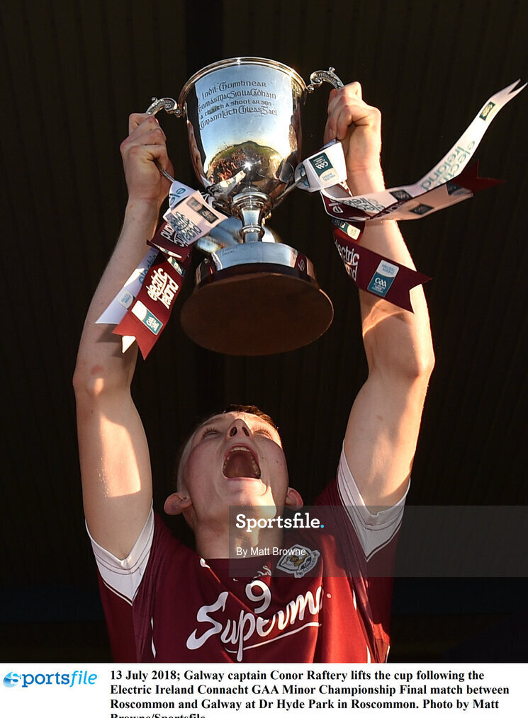13 July 2018; Galway captain Conor Raftery lifts the cup following the Electric Ireland Connacht GAA Minor Championship Final match between Roscommon and Galway at Dr Hyde Park in Roscommon. Photo by Matt Browne/Sportsfile